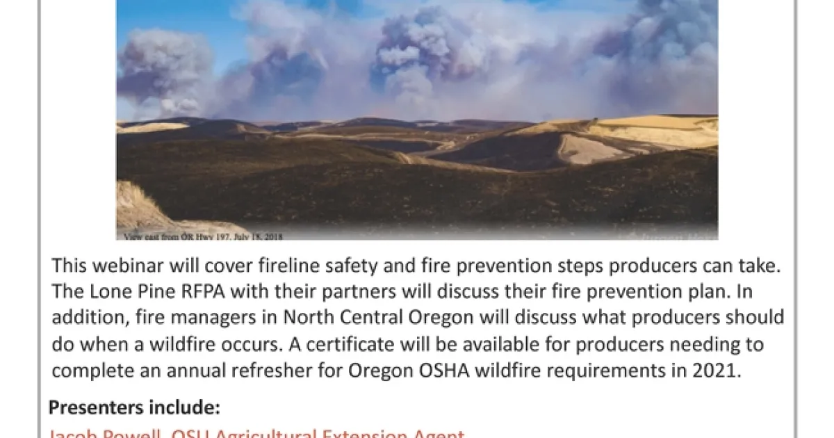 This free webinar with OSU Extension will cover wildfire safety and prevention for agricultural operations and small landowners. The Lone Pine Rangeland Fire Protection Association and their partners will discuss their fire prevention plan. In addition, the webinar will feature a roundtable discussion with local fire managers in North Central Oregon on what producers should do when they have a wildfire and how they can collaborate with first responders in suppression efforts. This webinar is one option for producers to attend an annual agricultural wildfire refresher in 2021 to meet Oregon OSHA requirements for producers with employees who engage in fire suppression on their property. Certificates will be available for attendees. Additional requirements are for producers and employees to receive some sort of initial wildfire training, along with having an emergency action plan for medical and fire emergencies, fire prevention plan, and Job Hazard Analysis form. See attached the flyer and click on this link to register: https://beav.es/Jqy