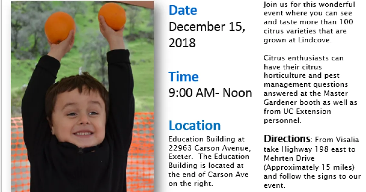 The general public is invited to join us for a family friendly Citrus Tasting Event. You can see and taste more than 100 citrus varieties that are grown at Lindcove Research and Extension Center. Take a bag of fruit home for $10. Choose from Cara Caras, Navels, Mandarins, or assorted citrus from 4 bins located in front of the Conference Center. The Master Gardeners as well as UC Cooperative Extension Advisors will be happy to answer questions from home gardeners and citrus connoisseurs.