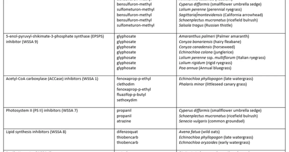 Table 1. A summary of herbicide resistance in California to single sites of action.