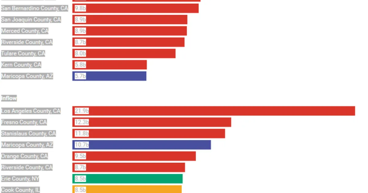In 2012, Los Angeles County both shipped (outflows) and received (inflows) more kilograms of food than any other U.S. county. Other California counties ranked highly in both categories.