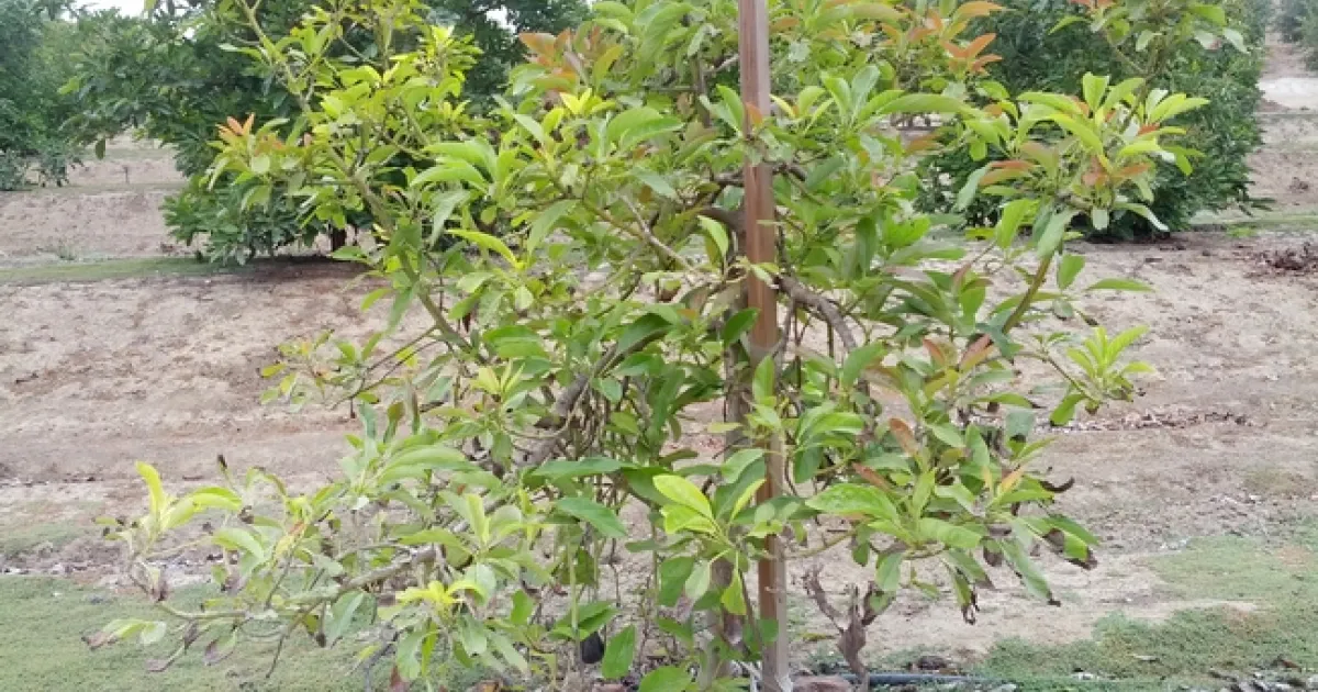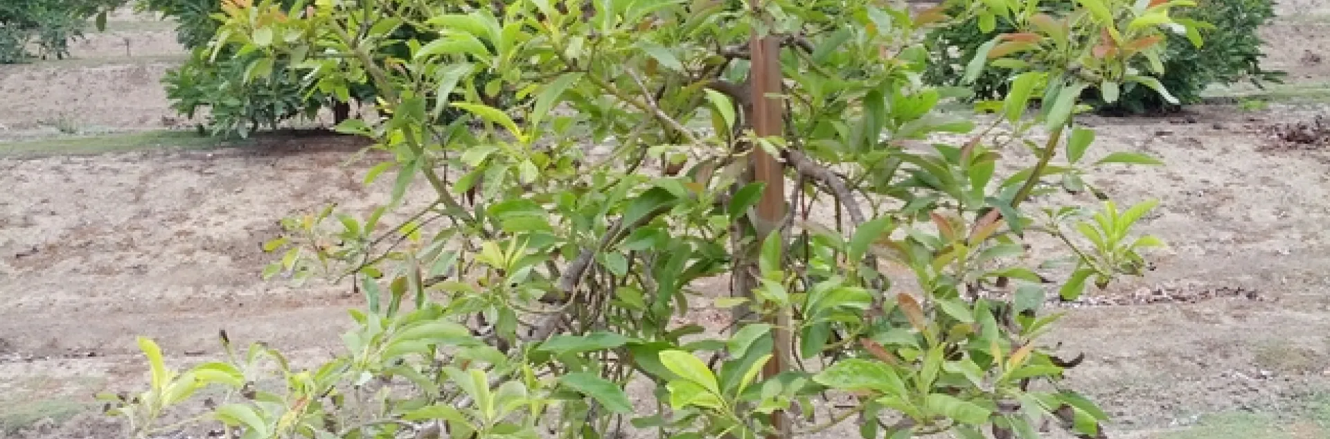 Iron chlorosis is an off duck. Soil is basically iron with some aluminum, silicon and oxygen added in for good measure, but plants can lack for iron because it is not available to be taken up. This is often because the soil pH is high due to carbonates which tie up the iron, causing it to precipitate. Another cause is asphyxiation of the roots from too much water. Avocados are especially sensitive to asphyxiation and will show classic interveinal chlorosis and as time goes on, the leaf will turn almost white. They will also show tip burn, like chloride damage in some cases, along with the yellowing. The image of the tree below is of an avocado in a loamy soil with a pH near 7, but is irrigated every two weeks with about 400 gallons of water – kind of boom and bust. The trees are drowning and showing classic iron chlorosis symptoms, but they could also be confused with root rot.