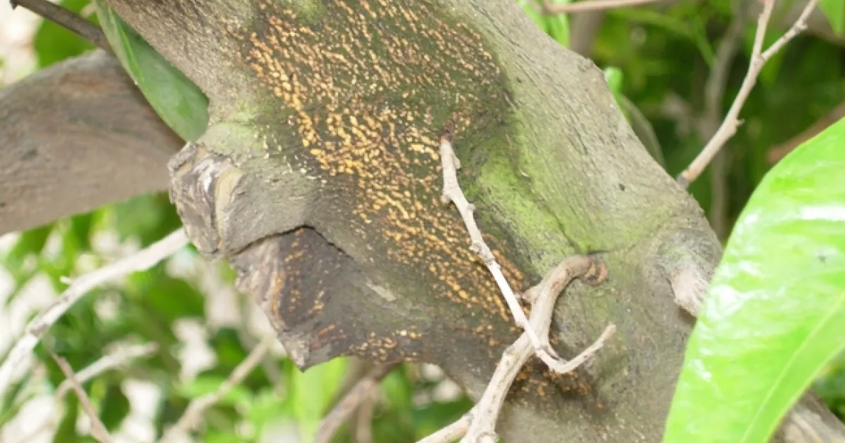 photo: Crusty pink fruiting bodies and wet area on lemon branch