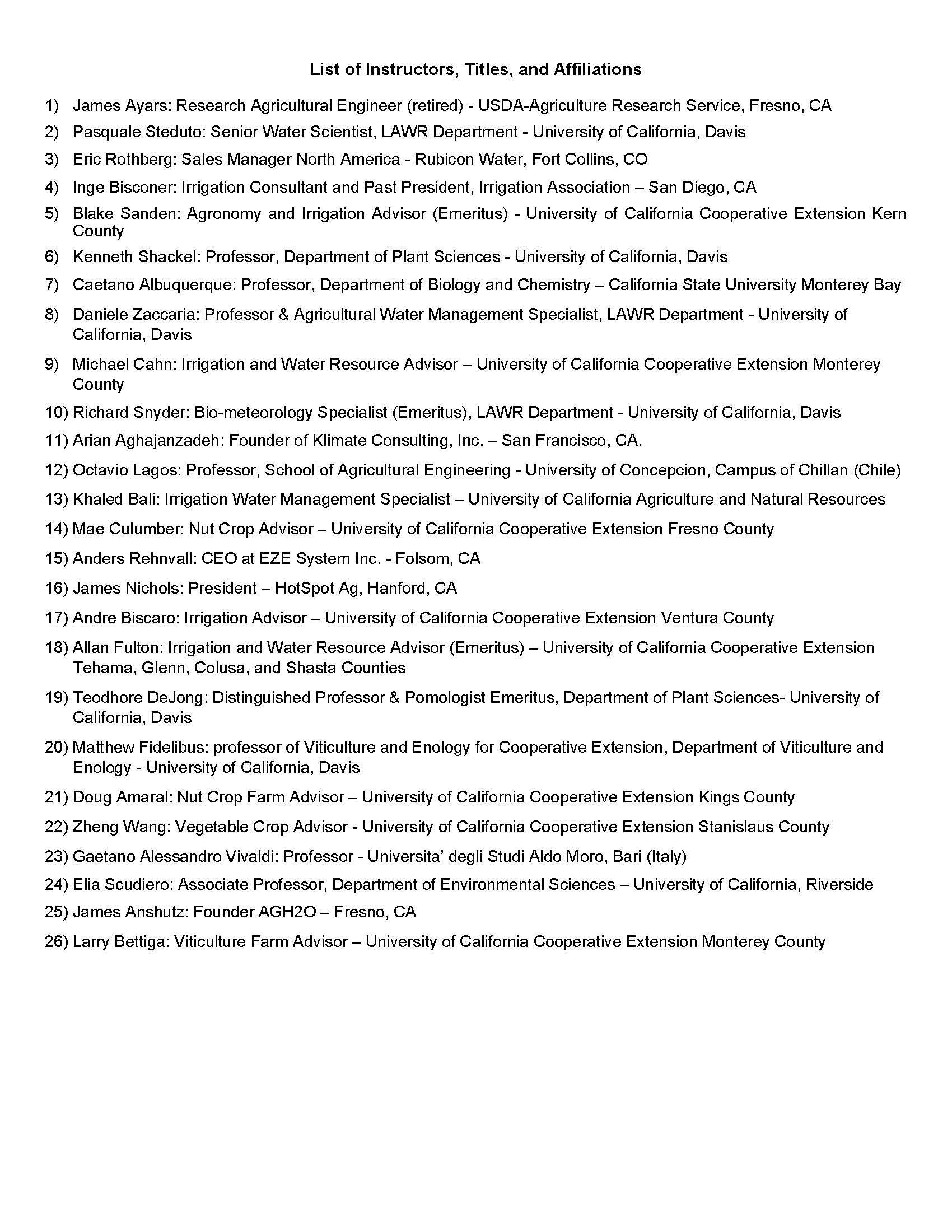 This special educational event is co‑organized by the UC Davis College of Agricultural and Environmental Sciences (UC Davis CA&ES), UC Agriculture and Natural Resources (UC ANR), the Chilean Water Technology Consortium (CoTH2O), and the California Irrigation Institute (CII). It’s designed for a broad audience, including - but not limited to - water resource planners and managers, irrigation designers and practitioners, crop consultants, farmers and ranch managers, university extensionists and educators, scientists and researchers, students and scholars, as well as personnel from government agencies, consulting firms, resource conservation entities, irrigation districts, groundwater management agencies, commodity groups, professional societies, and non‑profit organizations.