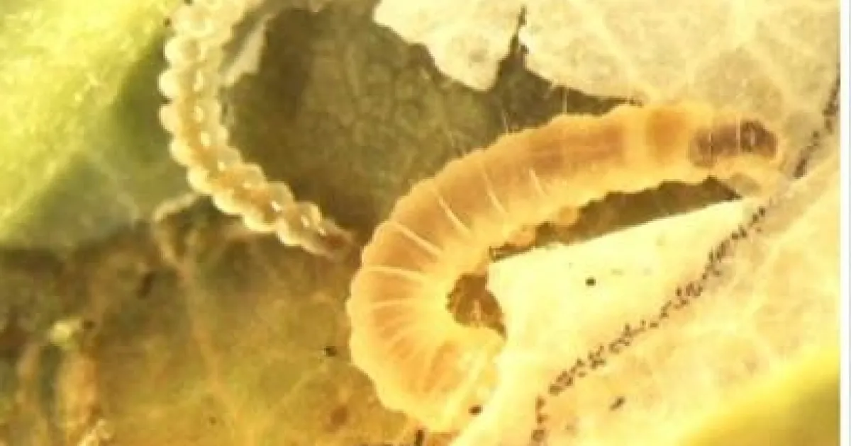 Larval leafroller with the parasite on it.
