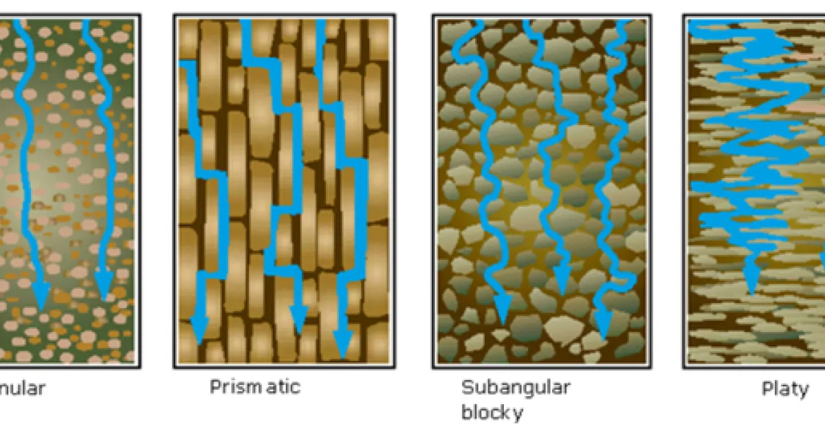 Water moves in a wetting front. When irrigation water hits the soil it moves down with the pull of gravity and to the side according to the pull of soil particles (more lateral with more clay). Soil is a jumble of different sized soil particles, from clay to silt to sand sizes and then often intermixed with stones of different sizes from gravels to boulder. The different textures determine how water moves. It moves fastest through coarse textures and slowest through finer ones – the clays, the ones with the smallest pores. But soils are a jumble of particle sizes and pores.