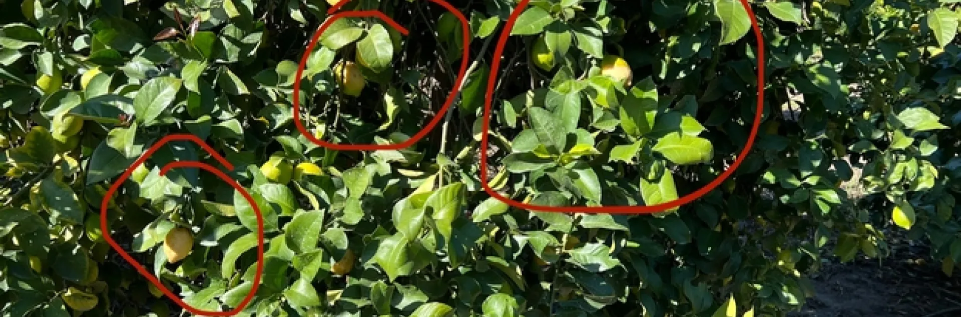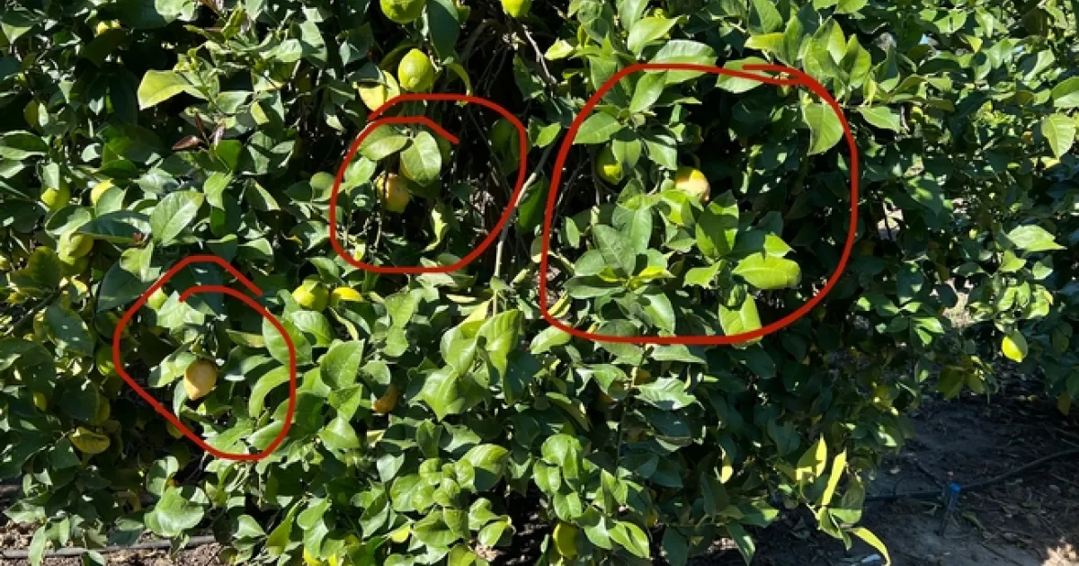 Septoria is less common than brown rot along the coast where a skirt spray is or used to be normal practice. This was before the drought and low lemon prices made the practice less common. In the case of septoria, a whole tree copper spray is recommended in the fall. The disease, although not unseen, is not common, so most growers would apply only a copper skirt spray for brown rot. With this 2023/2024 rain year, the disease has showed up in many orchards, and of course, it is above the brown rot spray line in the canopy.