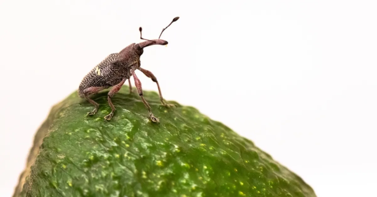 Avocado weevils, small beetles with long snouts, drill through fruit to lay eggs. The weevil grubs or larvae bore into avocado seeds to feed, rendering everyone's favorite toast topping inedible.