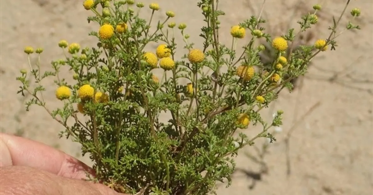 The plant is called stinknet (Oncosiphon piluliferum), which to me sounds like a game played by 10 year olds. However, the OC-CNPS considers it an emerging invasive weed (http://www.occnps.org/PDF/HYS-Oncosiphon-piluliferum.pdf). On the California Invasive Plant Council's weedmapper, it was first reported in the Orange Co. in 2003 but was in San Diego Co. as early as 1998 and Riverside Co. in 1981. According to the USDA-NRCS plants database, it has a limited distribution in the U.S., being found only in Orange, Riverside, and San Diego Counties in California and Maricopa, Pinal, and Yavapai Counties in Arizona. However, Cal-Flora has unconfirmed sightings of it in San Bernardino, Imperial, and Kern Counties.