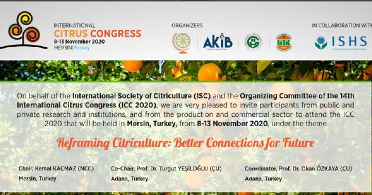 On behalf of the International Society of Citriculture (ISC) and the Organizing Committee of the 14th International Citrus Congress (ICC 2020), we are very pleased to invite participants from public and private research and institutions, and from the production and commercial sector to attend the ICC 2020 that will be held in Mersin, Turkey, from 8-13 November 2020, under the theme “Reframing Citriculture: Better Connections for Future”. The Congress is being organized by the Mediterranean Exporters' Association (MEA), Çukurova University (ÇU) and National Citrus Council (NCC). These three institutions will cooperate with universities, research institutes, associations, companies, growers, exporters and sponsors. The Congress that will be realized with attendance of all stakeholders concerning whole citrus industry attracts attention with all activities including a number of workshop, plenary, oral presentation and poster sessions which cover policies, comments, approaches under the theme “Reframing Citriculture: Better Connections for Future”. So citrus will be reframe for better connection in future