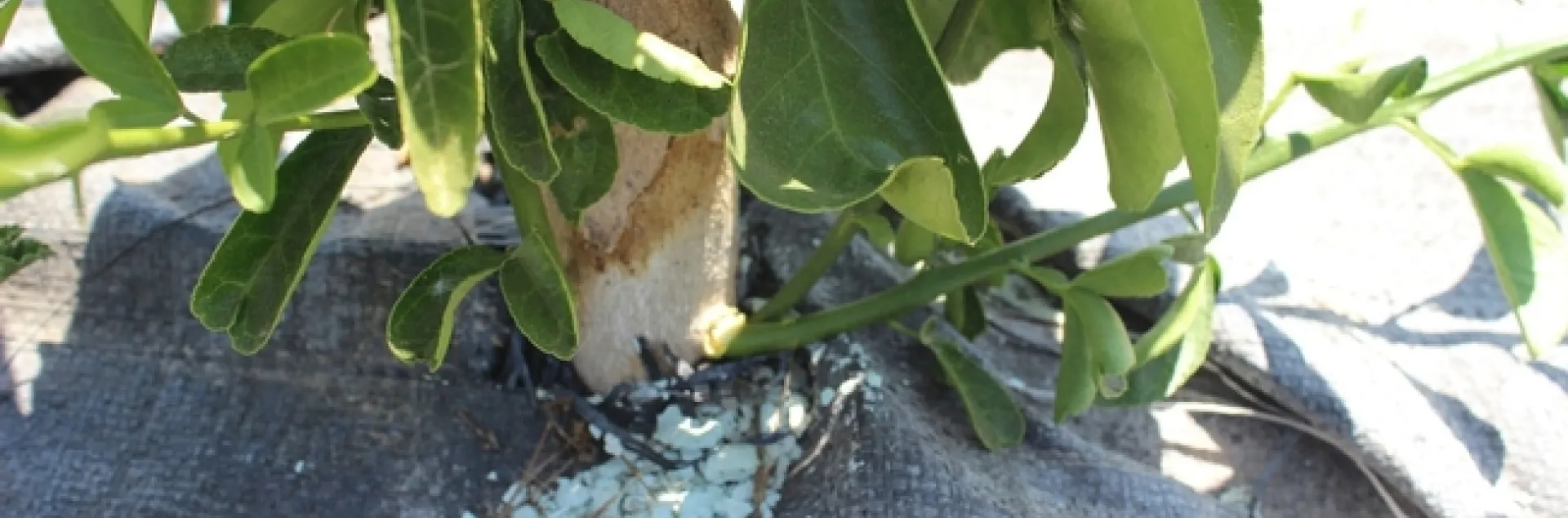 Since the first publication of this article on vole damage in citrus, a recent field observation regarding vole activity is worth noting. Voles prefer a situation where there is cover and shelter generally from weed or grass. In some orchards established in the last few years a plastic strip has been installed along the tree row for weed management (Fig 1). These strips appear to be offering a sheltered environment for vole activity in some cases (Fig 2). Recent observations in two such installations, one a block planted in 2013 and the other an eight year old planting exhibited significant vole activity. The young orchard at this point does not exhibit obvious tree damage although active tunneling is apparent (Fig 3). In the older orchard feeding damage to the trunks is very obvious (Fig 4).