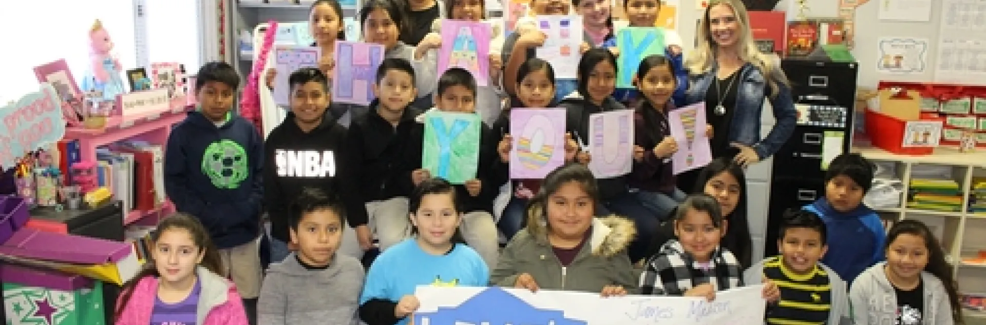 Mrs. Roxie Schallbereger's 4th grade class holding a thank you sign and the $5,000 check donated by Lowe's.