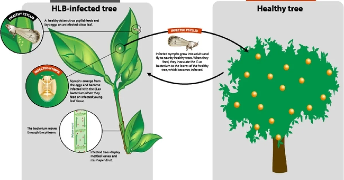 Huanglongbing, HLB, a bacterial disease of citrus also called Greening Disease, is spread by the Asian Citrus Psyllid. It causes the citrus fruits to be deformed and taste salty and bitter. HLB was first reported over a century ago in southern China. But why is it a problem for U.S. citrus? Diseases don't “respect” country borders and in 1998 the psyllid and the disease arrived in Florida in the early 2000's. Because there is no cure, damage caused in the largest orange producing state was extensive. By 2019, citrus production decreased in Florida by 74%. Despite federal bans on interstate movement of host plants, the psyllid did not abide by those rules!