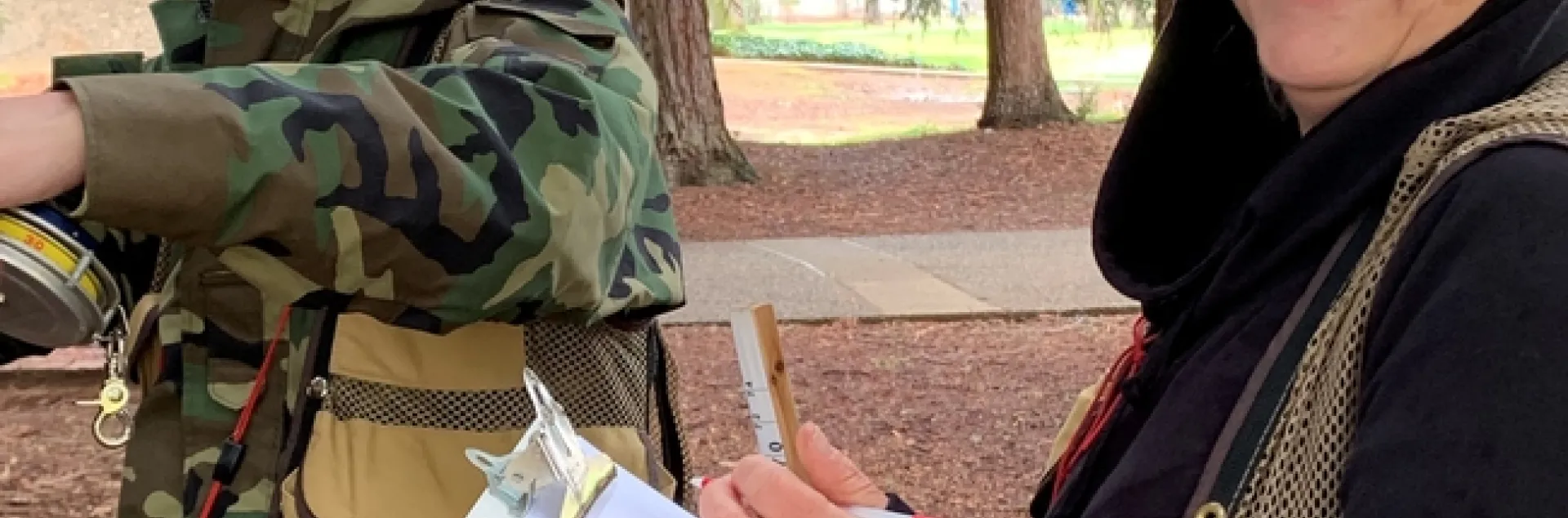 Workshop participants measuring and recording tree diameter.