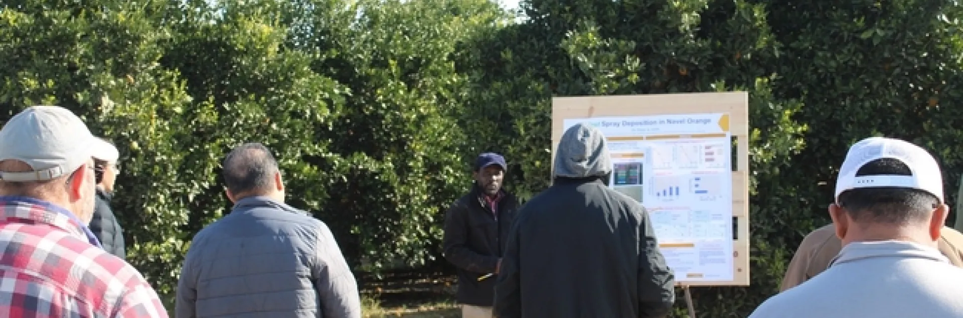 The Citrus Spray Field Day was a 4-hour classroom and field meeting that discussed pesticide application effectiveness, focusing on axial airblast spray applications directed to citrus (and other tree and vine) canopies. It was instructed by Dr. Peter Ako Larbi with support from hisAgricultural Application Engineering (AgAppE) Lab andKARE Center personnel. Discussions covered techniques and considerations for optimizing spray deposition and coverage as well as for minimizing pesticide drift. Sixteen participants were in attendance consisting of growers, applicators/operators, pest control advisers/certified crop advisors, regulators/policymakers, scientists/researchers, and others.