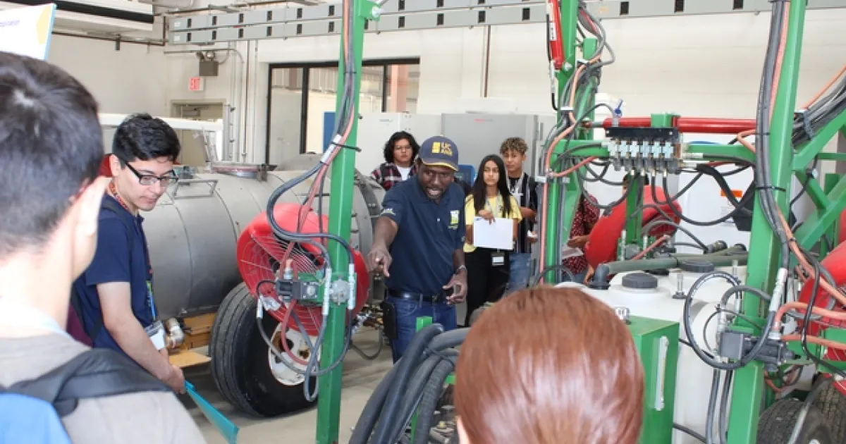 Participating this year for the first time, UC Cooperative Extension Specialist Peter Ako Larbi delivered a workshop to 85 high school students in four sessions at his Agricultural Application Engineering (AgAppE) Lab located at the KARE Center. The learning objectives were for the students to become familiar with the concept of spray application and to acquire some practical basic sprayer calibration skills. The topics covered included: introduction to spray application, which covered definitions of spray, properties of spray, and demonstration of atomization; nozzles; sprayers; and hands-on exercise in backpack sprayer calibration. In each session, students volunteered to assist with demonstrations.