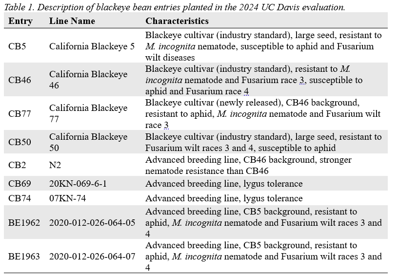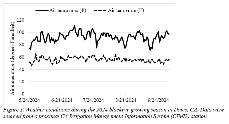 We planted a small-plot replicated blackeye bean variety trial on the UC Davis campus on May 24, 2024. Nine varieties were planted, including three industry standards, one newly released cultivar, and five advanced breeding lines (Table 1). The plots were 5-feet wide by 20-feet long, with two rows of beans planted down the bed. Each plot was planted with 160 seeds. The seeds were not inoculated before planting. Fertilizer and pest management was applied consistently across all plots. The soil type at the site is a Yolo silt loam, and the soil temperature was approximately 65 degrees Fahrenheit at planting. Seasonal weather conditions were marked by 22 days with a maximum air temperature that met or exceeded 100 degrees Fahrenheit (Figure 1). There was no precipitation during the growing season.