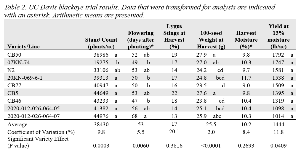 In Table 2, the varieties are sorted by harvested yield, which is expressed at 13% moisture. There were significant differences among varieties for stand count, flowering, and 100-seed weight. Variety 07KN-74 had a significantly lower stand count than nearly all of the other varieties. We anticipated that this would negatively impact its yield, but it did not, indicating that the plants were able to fill the beds and produce a large crop. Most varieties reached flowering between 47 and 56 days after planting, but experimental line 2020-012-026-064-07 took significantly longer to reach flowering, particularly compared to industry standard CB46. Varieties CB5 and CB50 had the largest seed size of all the varieties, and newly-released CB77 had the smallest. CB50 had the highest harvest yield among the varieties, but it also was impacted by lygus more than some of the newer material. CB77 and soon-to-be-released N2 yielded higher than industry-standard CB46 and had slightly lower lygus damage (though not statistically different).