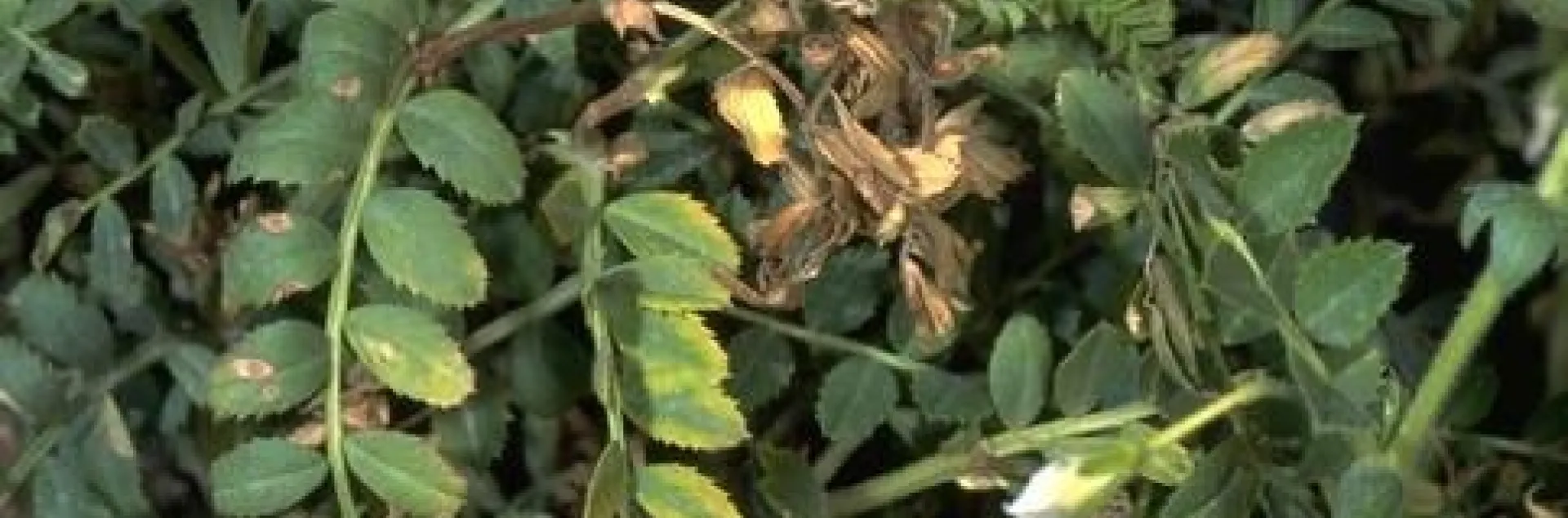 Ascochyta is a serious fungal disease of garbanzos that can kill seedlings and significantly reduce yields and seed quality in older infected plants. There are no other known crop or weed hosts. This disease is favored by cool, rainy weather and only infects the above ground parts of the plants. Early symptoms include circular light brown lesions on the plants that cause stems to weaken and break. Over time small, black, raised spots (pycnidia-like spores) will form concentric rings in the lesions. Developing seeds can become infected and, if used for seed, can lead to early infections in the next crop. The fungus survives outside or inside the seed.