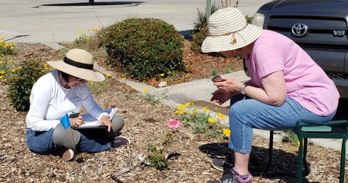 Two woman sitting next to a rose bush, one woman pointing at the plant and holding a cell phone, the other is taking notes about the characteristics of the small young rose in front of them.