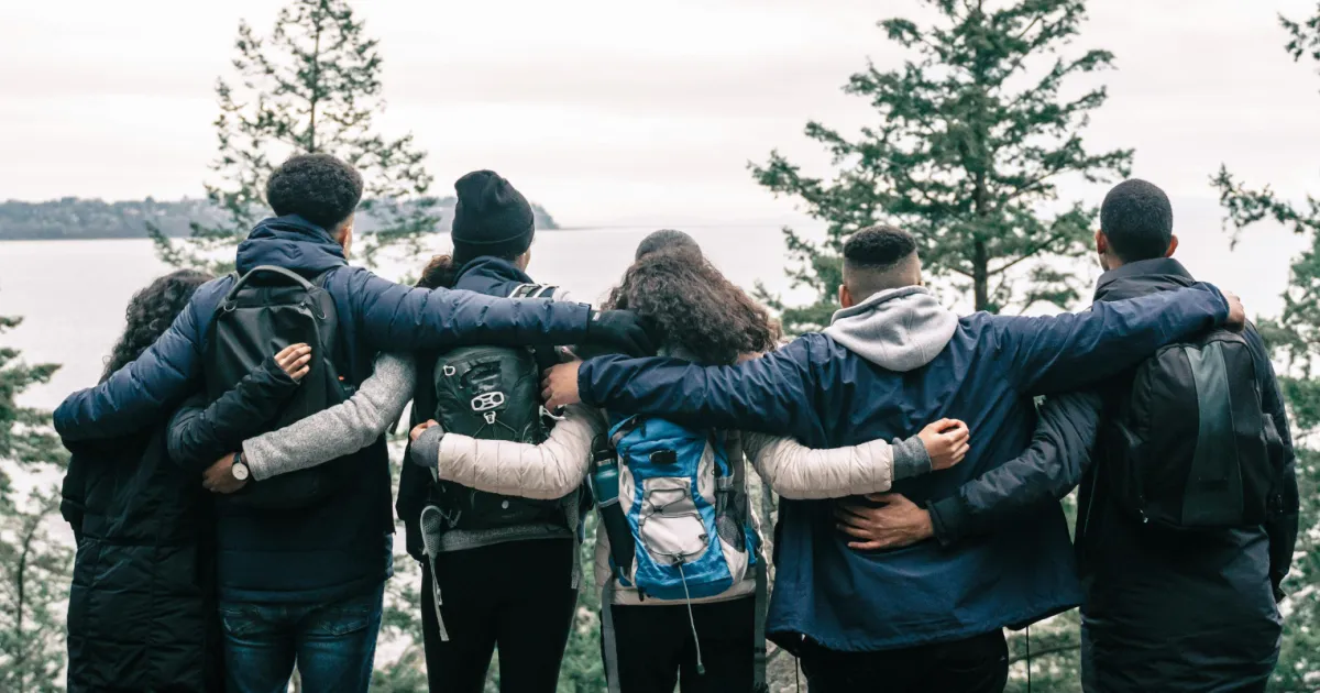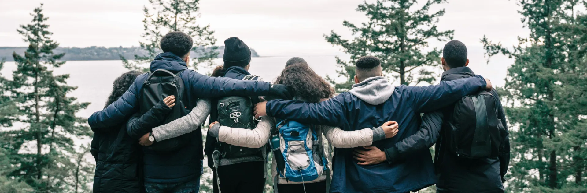 A diverse group of people wearing jackets and backpacks stand side by side with their arms around each other, facing a lake surrounded by evergreen trees.