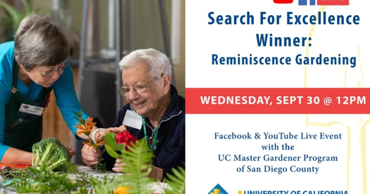 UC Master Gardener volunteers in San Diego County saw an opportunity to collaborate with residential memory care communities and Alzheimer's San Diego to provide sensory exploration and tabletop gardening activities for individuals living with dementia and their care partners. Currently, the Reminiscence Gardening Program can be found in nine locations. At each location, a team of UC Master Gardener volunteers engage participants in a way that encourages social interactions, stimulates garden memories, promotes relaxation, and relieves stress. With thoughtful planning and care, participants are paired with a UC Master Gardener volunteer who, for the next hour, guides and assists them through several activities including table-top gardening. Participants leave with their own “garden” to place in the activity room for all residents and visitors to enjoy.