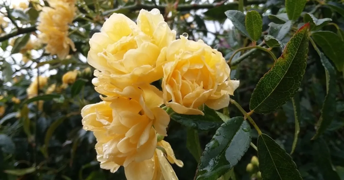 Picture your arbor, fence or bank covered with green foliage and large clusters of yellow or white blossoms in the spring! Originally from China, this climbing rose was named after Dorothea Lady Banks, wife of botanist Sir Joseph Banks. Two varieties include “Lutea” (pictured), with small, scentless double yellow blossoms; and “Alba Plena” with white, violet-scented blossoms. Both have glossy, leathery leaves on stems with a limited number of thorns. Many Rosa Banksiae plants bloom twice, first on last year's post-bloom growth, then on the growth of the current season, which lasts from early to late spring. Blooms attract bees and butterflies.