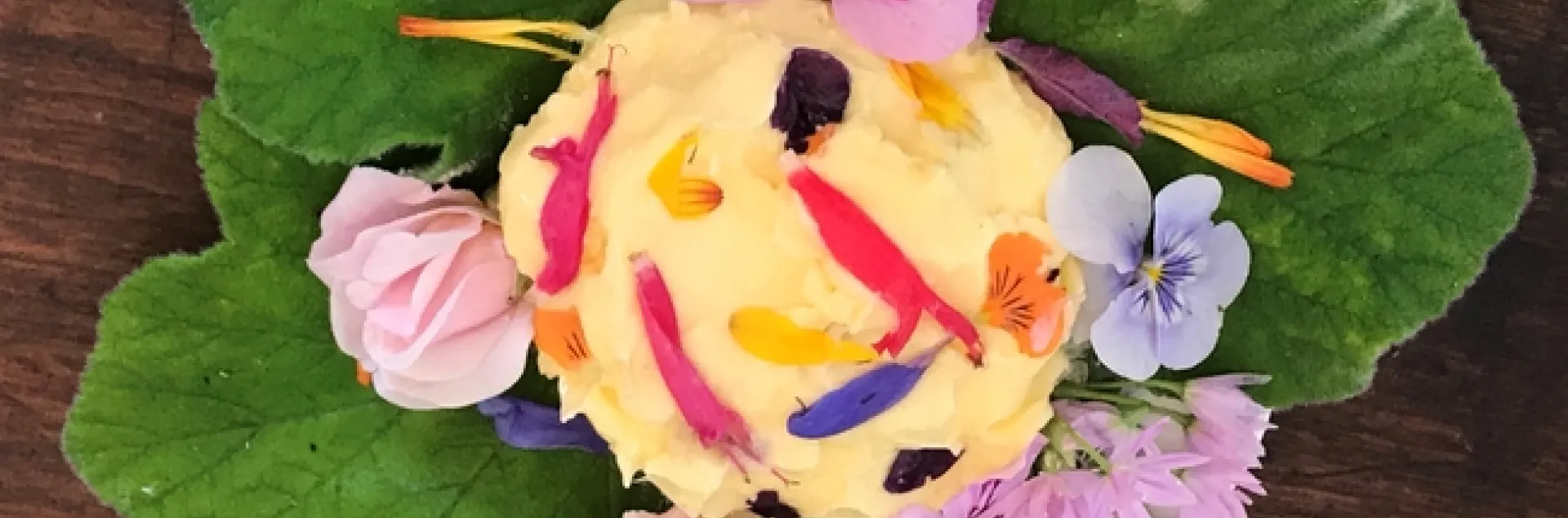 Place butter in a bowl and pour 1/2 cup of ice water over it. Press the butter with your fist until water clouds. Rinse. Discard water. Repeat until water is clear. Knead in edible flowers or herbs. Add salt if desired. Form patties, wrap with plastic and parchment paper labeled with date and ingredients. Refrigerate for two weeks or freeze for three months.