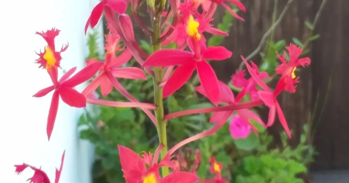 Description: Epidendrums are good starter orchid for first-time orchid growers. They can be kept outdoors where frost is not a factor and can adapt to a variety of light situations. Butterflies are attracted to the red, yellow, fuchsia, orange, or lavender flowers, while deer are not. Flowers grow on top of long stems originating from the base of the plant and each blossom of 20-30 tiny individual frilly flowers are clustered together. The oblong, evergreen leaves are leathery in texture and medium- dark-green in color. Use stakes or tomato cages to support vertical growth without sprawl. Propagate easily by cutting below the aerial roots, and planting in well-draining soil (in ground or pot) with fine-to-medium bark mixed with perlite for adequate drainage. Clay pots will require more water; plastic pots with drain hole can be used, as well as raised beds and planters if frost is not an issue. Epidendrums do not like salt spray at the coast. Grow in an enclosed courtyard or a greenhouse if needed. Fertilize with a balanced 20-20-20 orchid fertilizer, half-strength, weekly during the blooming season.