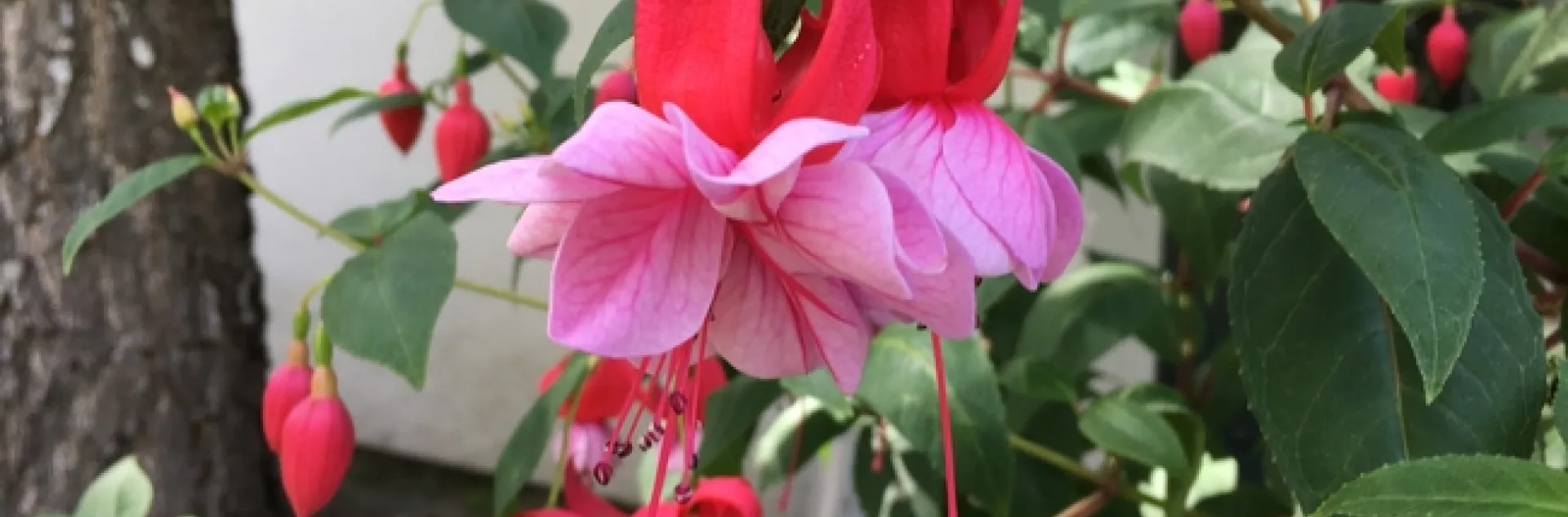 Narrative: Fuchsias are shade-loving plants with showy flowers. Most are native to the wet, mountainous regions of Central and South America; a few come from as far away as New Zealand and Tahiti. The genus includes 110 separate species that range in size from 6 inch spreading shrubs to 10-foot trees. Fuchsias begin growing in early spring and continue through October and November when they go dormant. Fuchsias may be planted directly into the ground in cool areas. However, most are planted in pots using a good commercial mix with adequate drainage and aeration. Plants must be kept moist but not wet, preferring watering in early morning or late evening.