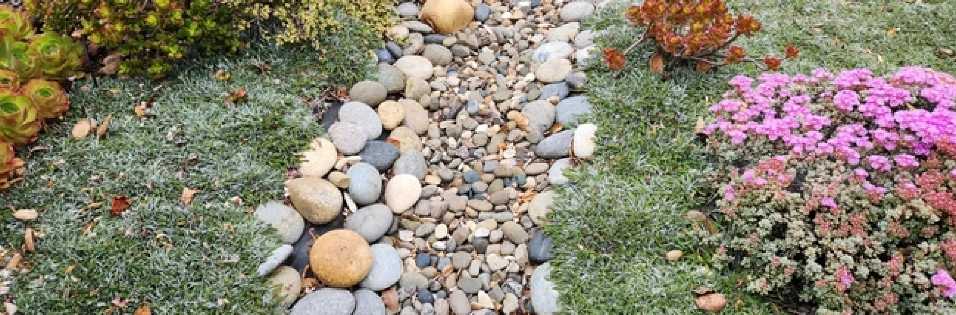 My roof provides more rain than the barrels accommodate, so I have sought additional solutions. Directing downspouts to planted areas points the water to a useful destination once the rain barrels are full. Creating a bioswale channel with curves and mounds to form a dry riverbed with stones and vegetation is visually pleasing during the year, and functional in the rainy season to slow, spread, and sink water into the soil as it journeys across the landscape. Succulents fare well in my bioswale, pictured above, along with Dymondia (Dymondia margaretae) as a ground cover.