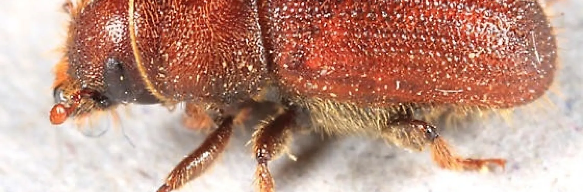 Most of us have seen the results of an infestation from this beetle - dead Monterey pine trees. But it is probably safer to say that most of us have not seen the culprit, the Red Turpentine Beetle. Like most bark beetles, it is small compared to other beetles, but is actually big for a bark beetle. The adult female beetle looks for Monterey pine trees that are under stress. Apparently stressed Monterey pines give off a certain chemical odor that the beetle can pick up on her antennae. As most of us know, we have had a lot of stressed Monterey pines in our area recently, due to a prolonged drought. Monterey pines that had a source of water during this drought were able to avoid being killed by the beetle - those that didn't, were not long for this world. After being attracted to a potential host tree, the adult beetle will bore into the bark. If she comes across a sap tube that is functioning properly, she is overwhelmed by sap and either pushed out of the hole or killed by being engulfed by sap. If this does not happen, she goes on to build an egg chamber. This is the beginning of an infestation in that tree and will most likely lead to its death. Somewhere along this process of forming an egg chamber, she will release a pheromone, attracting other Red Turpentine Beetles to the same tree. This overwhelming attack is usually more than the tree can overcome, especially a stressed tree.