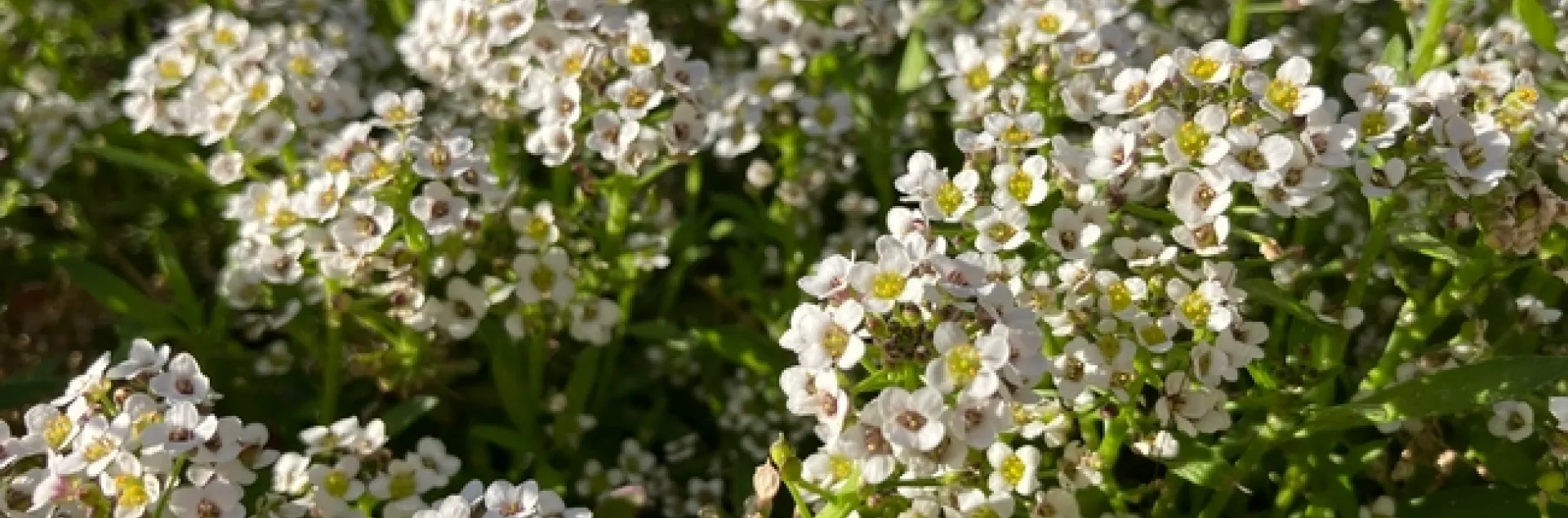 There are many reasons to love this versatile little plant. Sweet alyssum is easy to grow and offers an abundance of tiny blooms that have a showy, fluffy texture, making them a staple in many gardens. Alyssum only needs soil with good drainage and ample light. Full sun with dappled shade in hotter climates is important. Small 6-packs from local nurseries are readily available. Once planted, they quickly develop into low growing clumps with many blooms. The most common color is white; however purple and pink flowering plants may be available. The common name, sweet alyssum, comes from the honey-scented blossoms that beneficial insects can't resist.