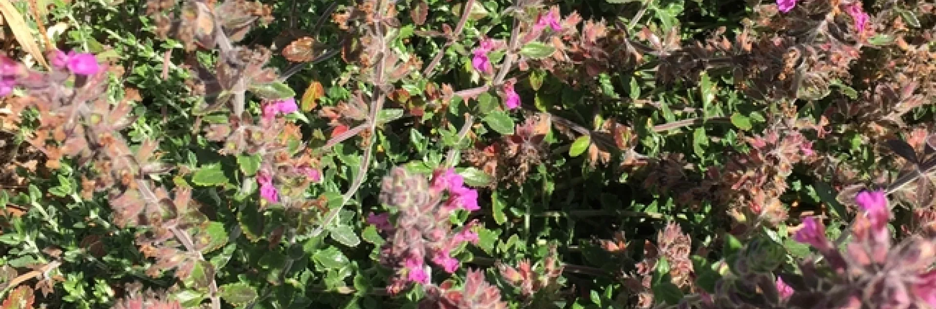 Narrative: This member of the mint family is a small, mounding subshrub with deep green, fragrant leaves that have toothed margins. It is native to dry hillsides and open woods in the Mediterranean region. But it is equally adapted to the coastal, inland and valley gardens of California. Red-purple or white flowers bloom throughout summer on loose stalks. These should be trimmed off at the end of their season to maintain good foliage density. Older stalks and branches lying on the ground should be regularly removed. Wall germander loves poor, gritty soil but does well in a variety of other soil conditions as long as drainage is adequate. It is fire resistant if kept hydrated. Wall germander is found in both herb and wildlife gardens where it is attractive to bees and butterflies. Deer leave it alone. It is a popular topiary and border plant and may be kept in its pleasing natural form or clipped into a small hedge.