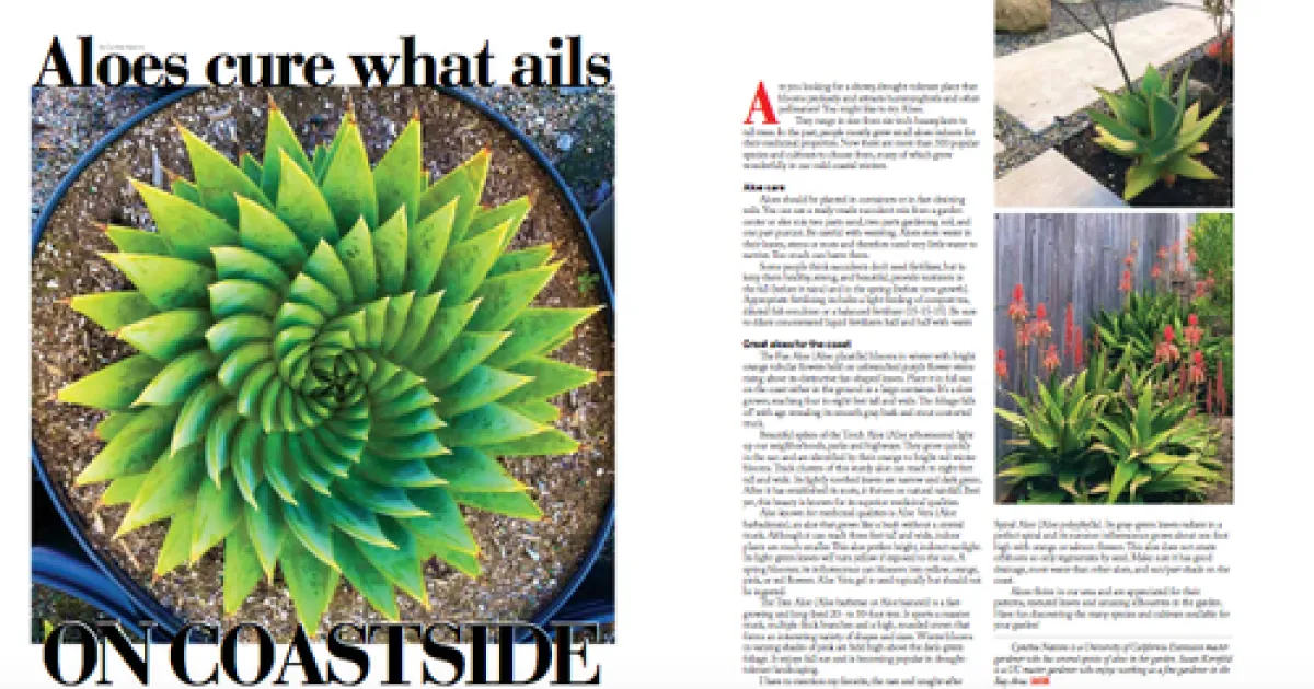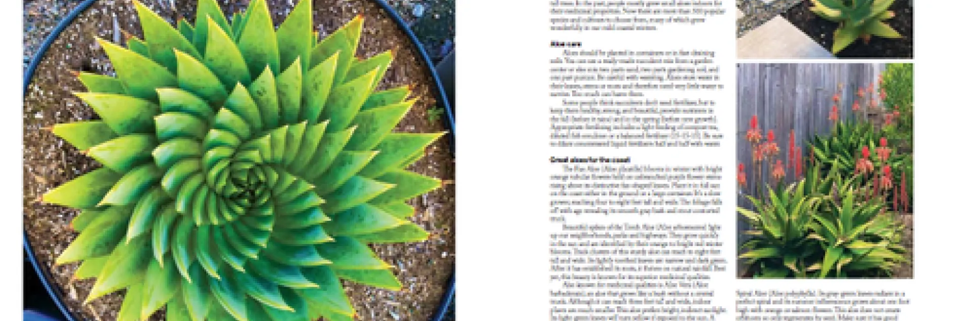 I have to mention my favorite, the rare and sought-after Spiral Aloe (Aloe polyphylla). Its gray-green leaves radiate in a perfect spiral, and its summer inflorescence grows about one foot high with orange or salmon flowers. This Aloe does not create offshoots so only regenerates by seed. Make sure it has good drainage, more water than other Aloes, and sun/part shade on the coast.