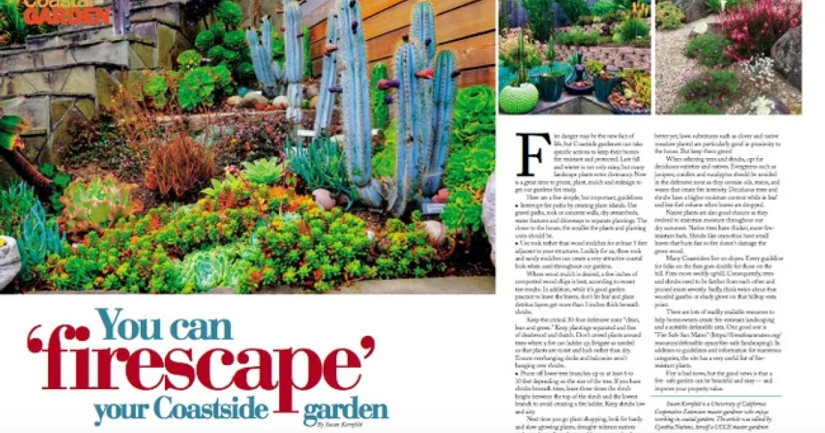 Fire danger may be the new fact of life, but coast side gardeners can take specific actions to keep their homes fire resistant and protected. Late fall and winter is not only rainy, but many landscape plants enter dormancy; therefore, now is a great time to prune, plant, mulch, and redesign to get our gardens fire ready.