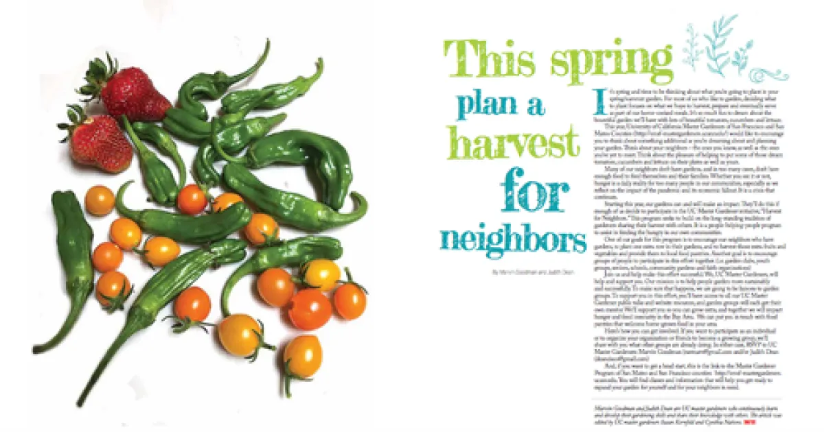 This year, University of California Master Gardeners of San Francisco and San Mateo Counties would like to encourage you to think about something additional as you're dreaming about and planning your garden. Think about your neighbors – the ones you know, as well as the ones you've yet to meet. Think about the pleasure of helping to put some of those dream tomatoes, cucumbers and lettuce on their plates as well as yours.
