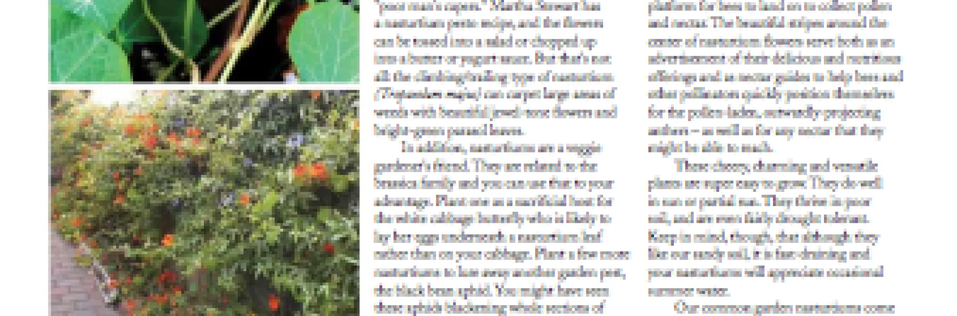 Our common garden nasturtiums come in two types: the rambling, rambunctious climbing type (Tropaeolum majus) that can grow up to ten feet long or tall; and the more modest bush or dwarf type (Tropaeolum minus). Although compact, the latter offers the same big, beautiful, round green leaves and jewel-tone flowers as the larger trailing types. Let the climbing nasturtium sprawl over those weedy corners or fill out a fence vine or trellis, and put the bushy varieties in containers or planted throughout the garden to add paint-pots of color. Then, simply enjoy.