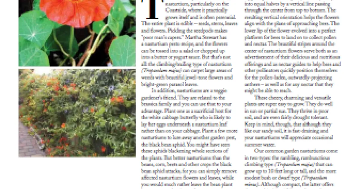 There are few plants as fine as the nasturtium, particularly coastside, where it practically grows itself and is often perennial. The entire plant is edible – seeds, stems, leaves, and flowers. Pickling the seedpods makes "poor man's capers." Martha Stewart has a nasturtium pesto recipe, and the flowers can be tossed into a salad or chopped up into a butter or yogurt sauce. But that's not all: the climbing/trailing type of nasturtium (Tropaeolum majus) can carpet large areas of weeds with beautiful jewel-tone flowers and bright-green parasol leaves.