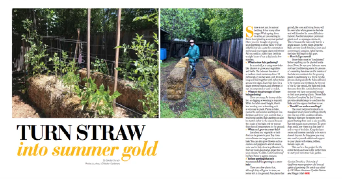 Just about any vegetable or herb that can be grown in your bay area microclimate can be grown in a straw bale. You can also grow flowers such as cosmos and poppies to add all-season color and to help draw in pollinators. To find out more about what grows best in your climate, Golden Gate Gardening by Pam Peirce is a great resource.