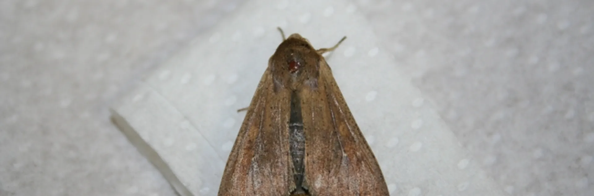 Below are pictures of the true armyworm and western yellowstriped armyworm, the two species we find in rice. I'm not a great photographer, but the pics lets you see that both are somewhat large, thick moths. The true armyworm moth is straw colored, the western yellowstriped armyworm has a greay and browm pattern on the wings. Click on the pictures to see a high resolution image.
