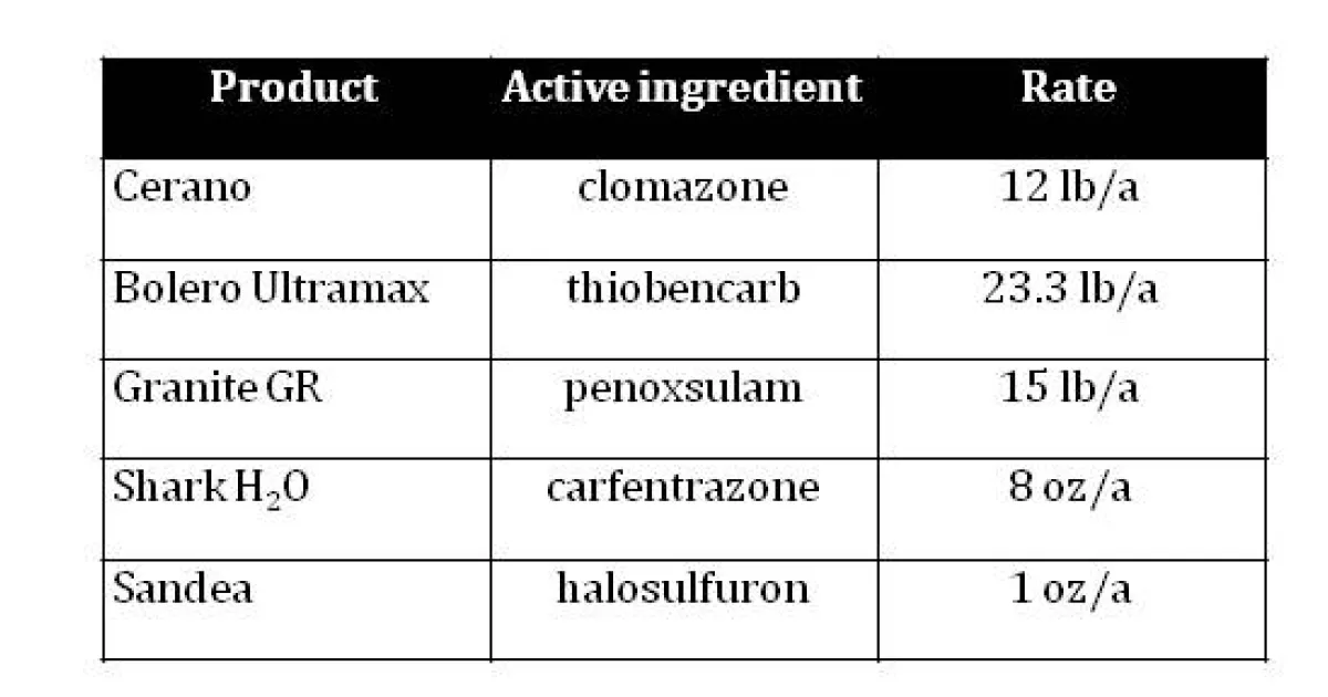 In continuous flood, Cerano caused bleaching and eventual death of the small plants. The later application of Cerano slowly bleached the plants and it is believed that they will not be able to produce viable seed. Bolero Ultramax activity was fairly slow, but eventually killed both young and older plants when flood was maintained. Granite GR slowly bleached the young plants and it is expected to fully control the weed at that stage; however, more established plants survived the treatment and would likely set seed. Shark H2O initially appeared to be very efficacious on both plant sizes; however, plants were able to survive the treatment by putting on new leaves. These plants eventually flowered and would be expected to produce viable seeds. Sandea applied to the flood water did not control the weed although it caused some malformations of the typical plant. It is likely the plants surviving the Sandea treatment would set seed.