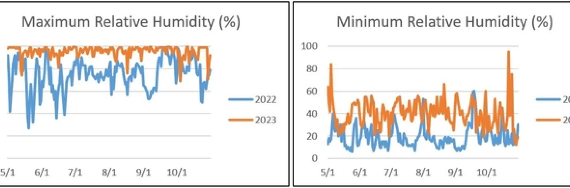 Fig. 1. Maximum and minimum percent relative humidity for 2022 and 2023 at the Williams CIMIS station.