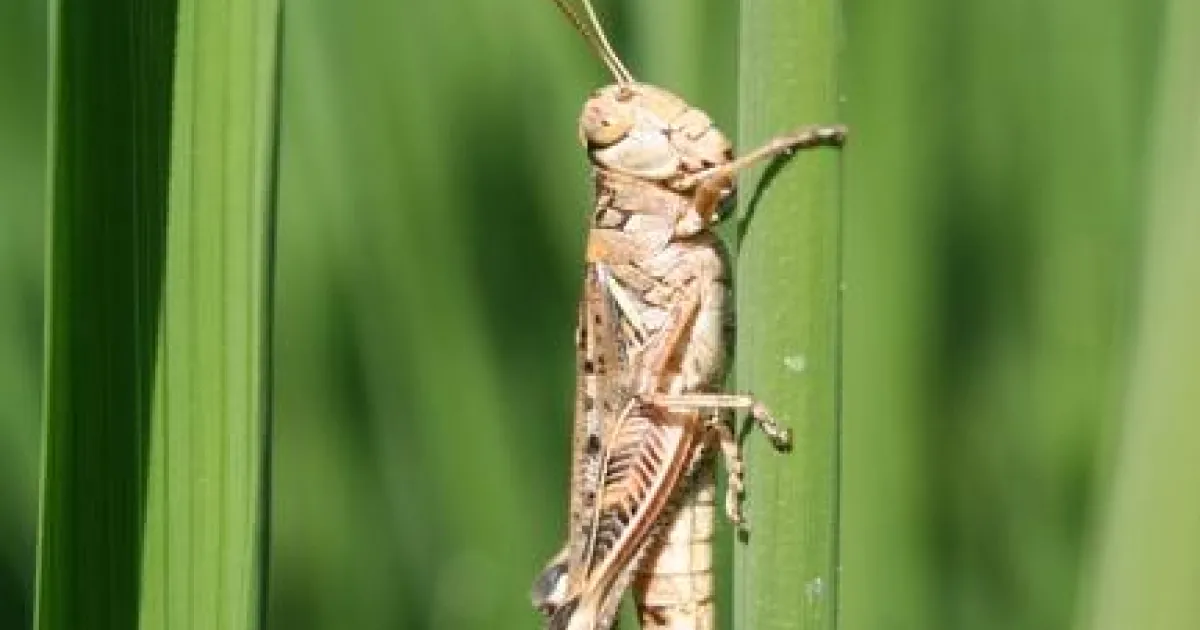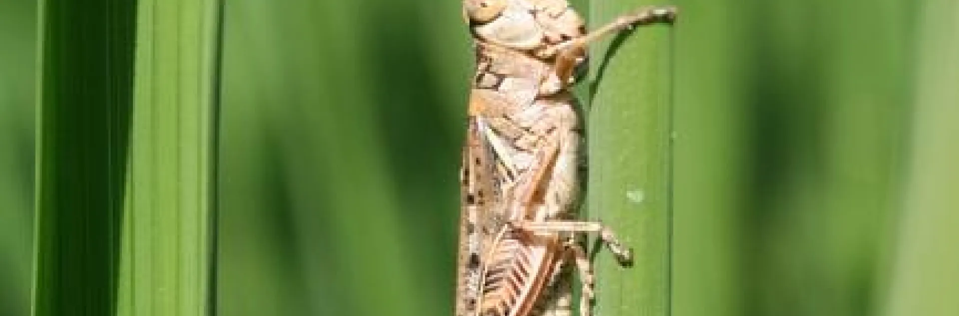 The grasshoppers in rice are about 1.5 inches long. They are easily disturbed and can be seen flying out as one moves through the rice. If you see grasshoppers, keep an eye on the population. In general, a treatment for grasshoppers is not recommended unless their population is high and they injure panicles.
