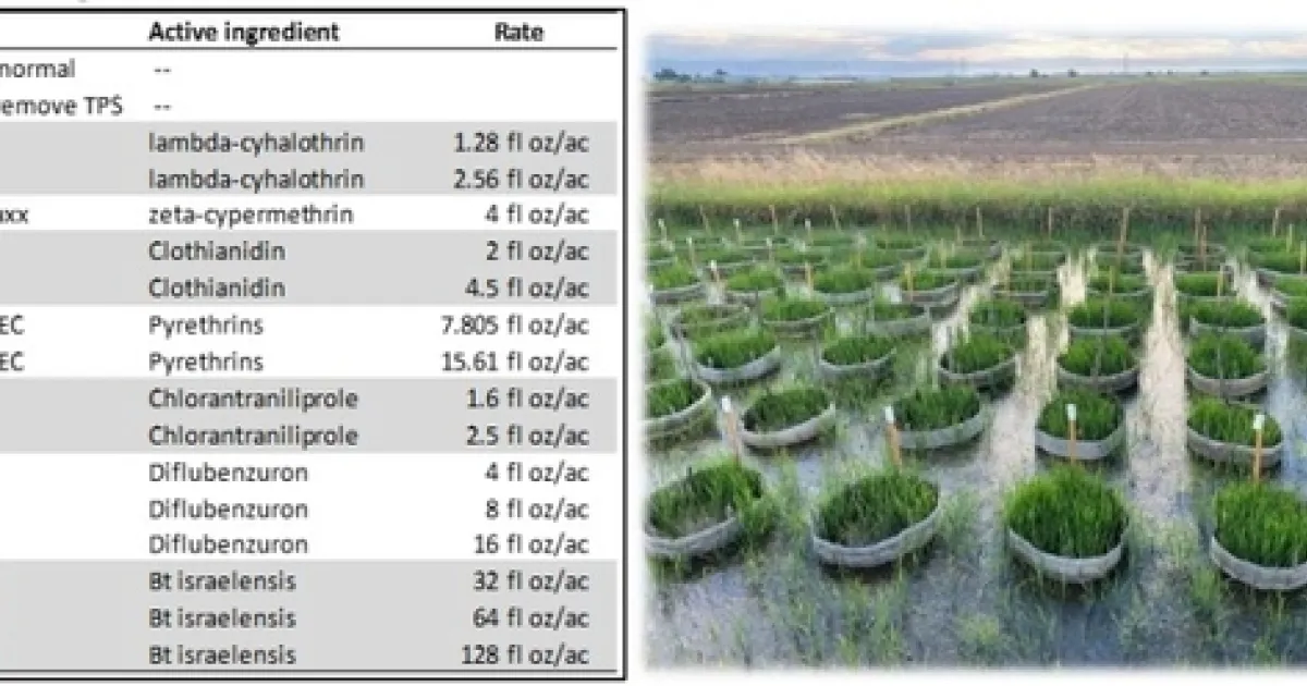 These results were a bit more “pronounced” than our 2022 trial in that the materials generally worked better across the board. The general lack of efficacy we saw with pyrethroids was consistent though. Vantacor and Aquabac XT were especially effective, even at the lower rates we tested, so this is something we think will be worthwhile following up on and learning more about their possible fit in rice IPM.