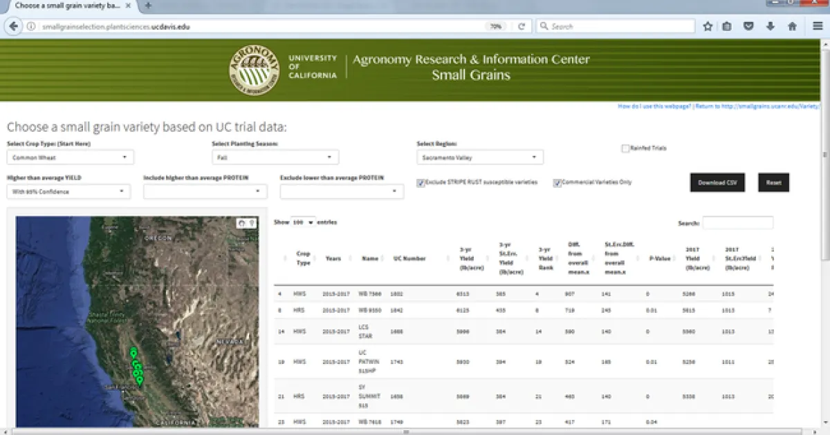 The tool is designed to help users pinpoint small grain varieties that have performed well in particular regions and environments of California using data from multi-year, multi-location field trials. The main features of the tool are a series of selection menus that interact with a map to give the user real-time feedback on how particular crop selections are represented geographically in the trial data, and a custom table that is returned based on these selections and can then be modified based on a series of additional selections available to the user.