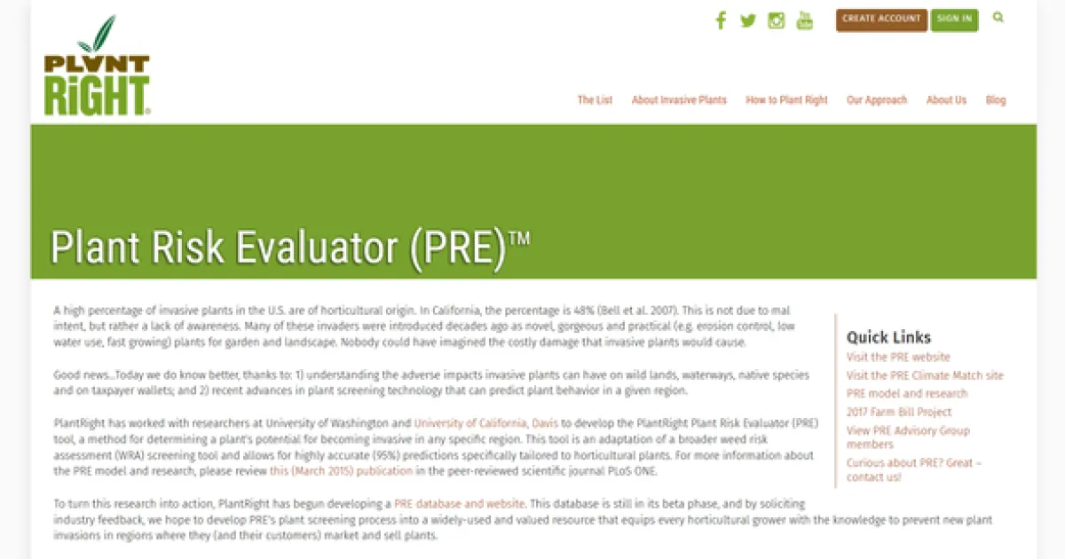 One of the ways by which PlantRight accomplishes this is by use of the Plant Risk Evaluator (PRETM) tool (https://plantright.org/approach/pre/). The tool assesses whether a species has a high or low risk of becoming invasive in a particular area or whether the species requires more research to assess potential invasiveness. PlantRight worked with researchers at University of California-Davis and University of Washington to develop the PRE tool (https://doi.org/10.1371/journal.pone.0121053).