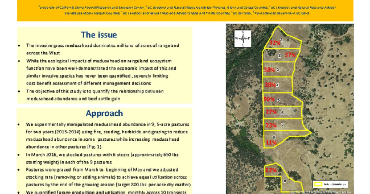 Here is a short summary written by Theresa Becchetti, University of California Cooperative Extension (UCCE) Livestock and Natural Resource Advisor on the Effects of Medusahead on Beef Cattle Gains project.