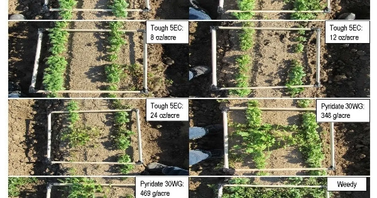 In 2021, I conducted two herbicide evaluation trials on commercial basil fields of Ratto Bros, Inc. in Modesto, California (37.687312, -121.192401 and 37.679212, -121.142669) with the collaboration of IR-4. The purpose is to understand if two Pyridate-containing herbicides, ‘Tough 5EC' and ‘Pyridate 30WG', perform consistently on weed control and prevention of basil leaf injury. Tough 5EC and Pyridate 30WG are currently used on field corn, chickpea, and mints but are not registered for use on basil. They both have the active ingredient of Pyridate (Carbonothioic acid, O-(6-chloro-3-phenyl-4-pyridizinyl) S-octyl ester)and are contact herbicides within Group 6. They are post-emergence herbicides for the selective control or suppression of actively growing annual broadleaf species. The active ingredient of Pyridate is absorbed by plant leaves. Neither offers any residual weed control. Therefore, weeds must have emerged at the time of spray and not grown beyond the proper application stage to prevent decrease of control.