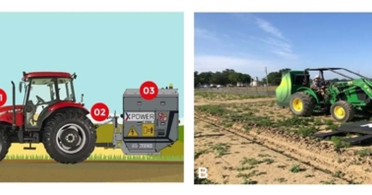 The EWC machine we are using was manufactured by Zasso, a Brazilian company. The EWC machine has several parts shown in Figure 1. The tractor engine locally generates the electric power, and the transformer at the back of the tractor will generate the high-frequency electric current. Our machine is configured to treat one-side of the tree row (Figure 1B). The applicator unit has two electrodes, one at the front that is positively charged and applies current to the plants and another towards the rear of the unit that touches the ground and completes the electrical circuit as the electricity exits the plant roots into the soil.