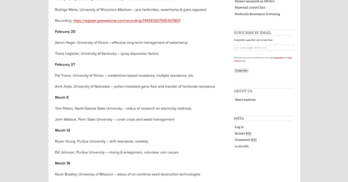 The free webinar runs every Thursday (Feb. 13-March 26, 2020) at 11 AM EST. You can register at http://iwilltakeaction.com. If you miss one, you can go to the OSU Weed Management website and click on MULTIMEDIA (https://u.osu.edu/osuweeds/multimedia/webinars/). There will be a link to the recording.